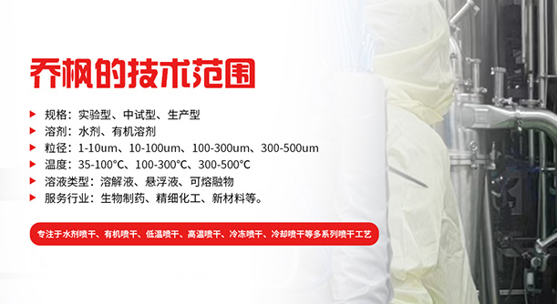 上海喬楓實業有限公司,成立于2012年,是從事噴霧干燥設備的研發(fā)設計、生產、銷售(小型噴霧干燥機,實驗型噴霧干燥機,35℃低溫噴霧干燥機,有機溶劑噴霧干燥機,低溫閉式循環(huán)噴霧干燥機、超細粉末噴霧干燥機、噴霧冷凍干燥機、真空噴霧干燥機、氣流噴霧干燥機,噴霧造粒干燥機,離心噴霧干燥機,沸騰制粒機等)和售后于一體的綜合性公司,本公司現成為一家致力于為生物制藥、精細化工、新能源、陶瓷造粒及食品工程等領域提供全套解決方案的整線交鑰匙工程企業。